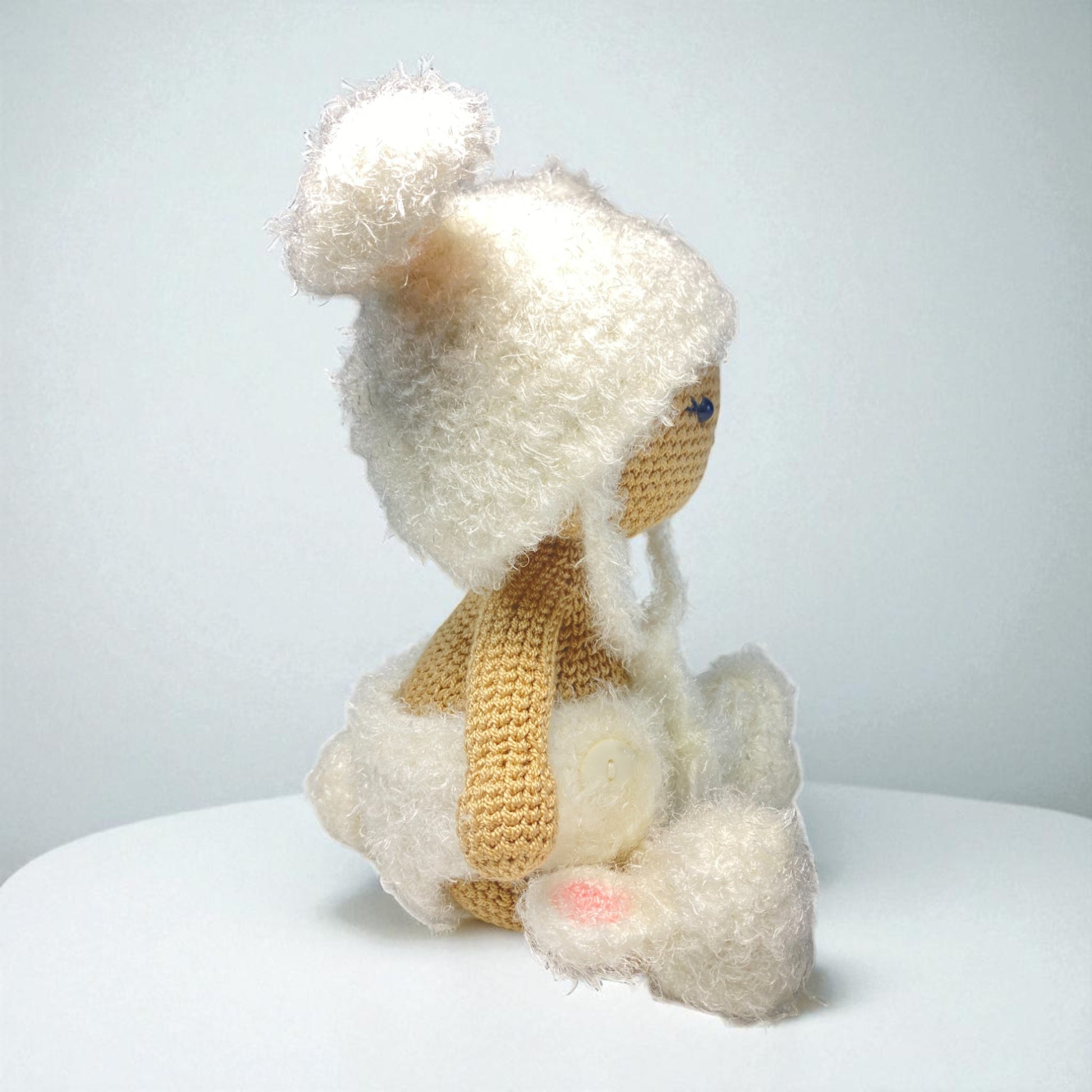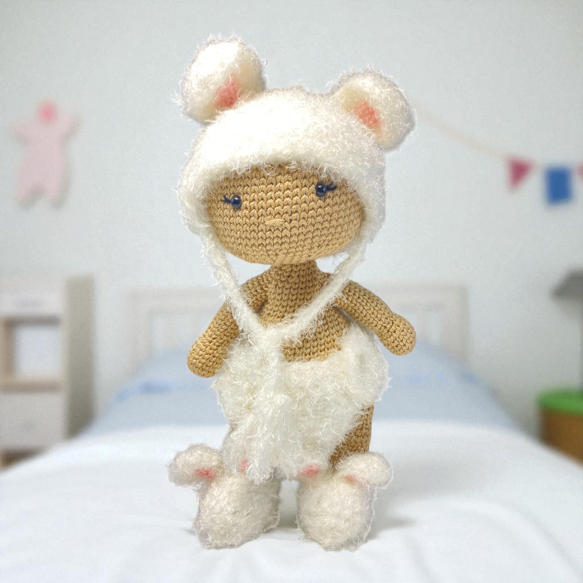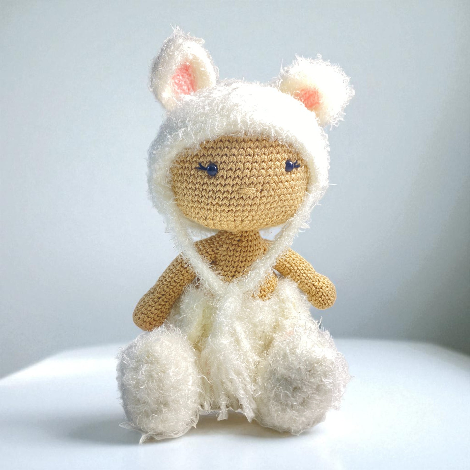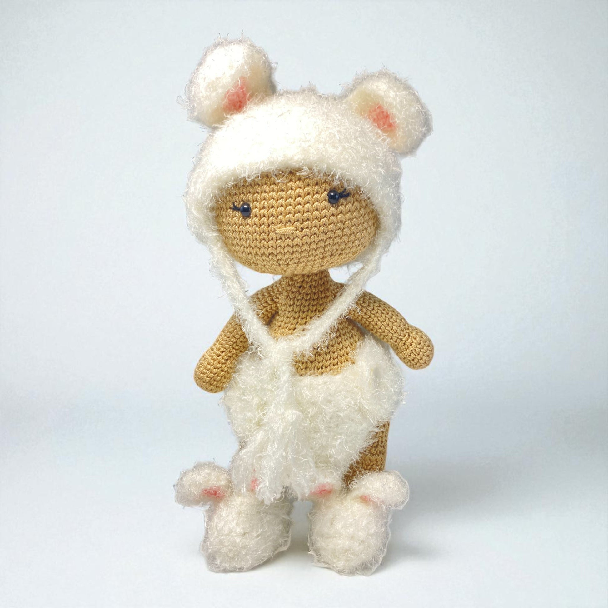 This adorable bear comes dressed in a removable fluffy white bear hat with ears, a cozy matching wrap, and soft bear booties, making Snowy ideal for dress-up fun and imaginative play. The delicate hand-stitched features add an heirloom touch, ensuring that this crochet doll is not just a toy, but a treasured keepsake.